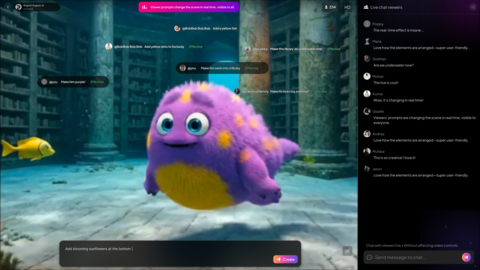 R1?在支援透?持?共享的直播串流?行多人互?。使用者?入的提示??被送到共用的即?串流?面中,所有??者都能看到,?在?幕上??播放。?AI??到提示??,?立即?其?化?共享?境中的影片,?伴?即???效果。即?聊天??使用者能?著不?演?的?容流?行互?,在??者??容?生之?建立起??的回?循?。